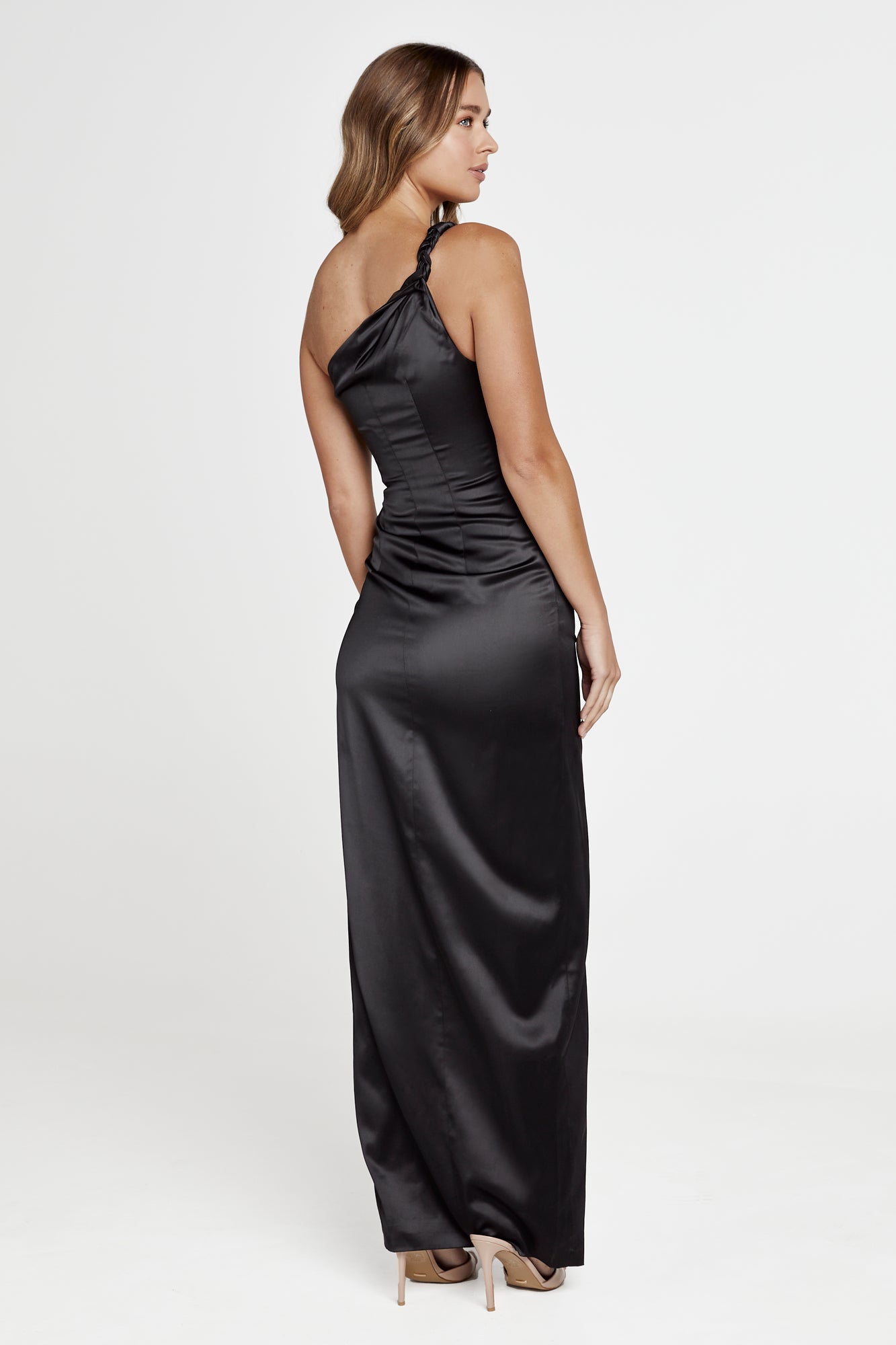 Elevate your evening with our one-shoulder braided satin gown. Crafted from luxurious satin, its asymmetrical neckline and intricate braided detailing radiate elegance. With a thigh high split, it offers sophistication, ensuring you make a statement at any event.