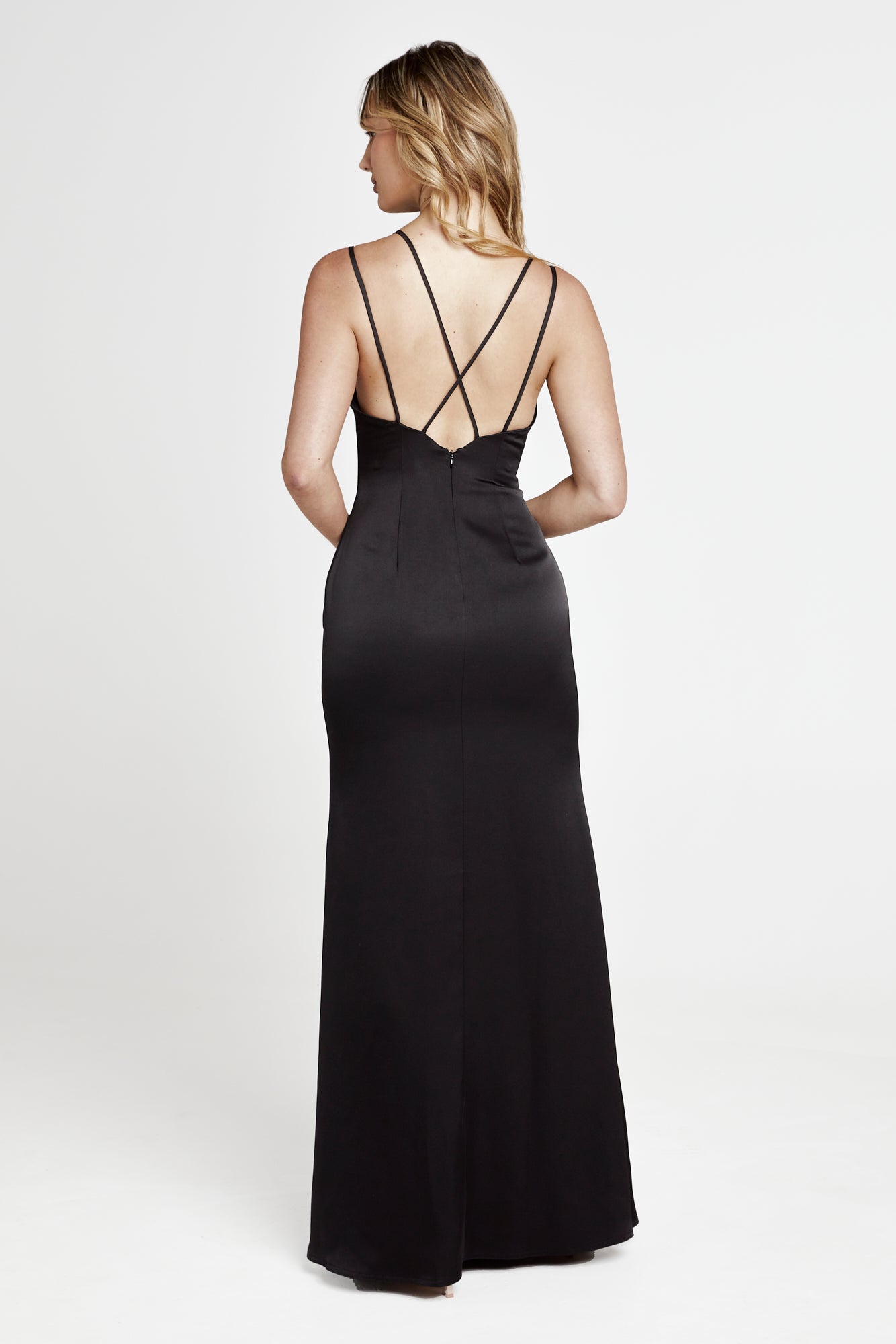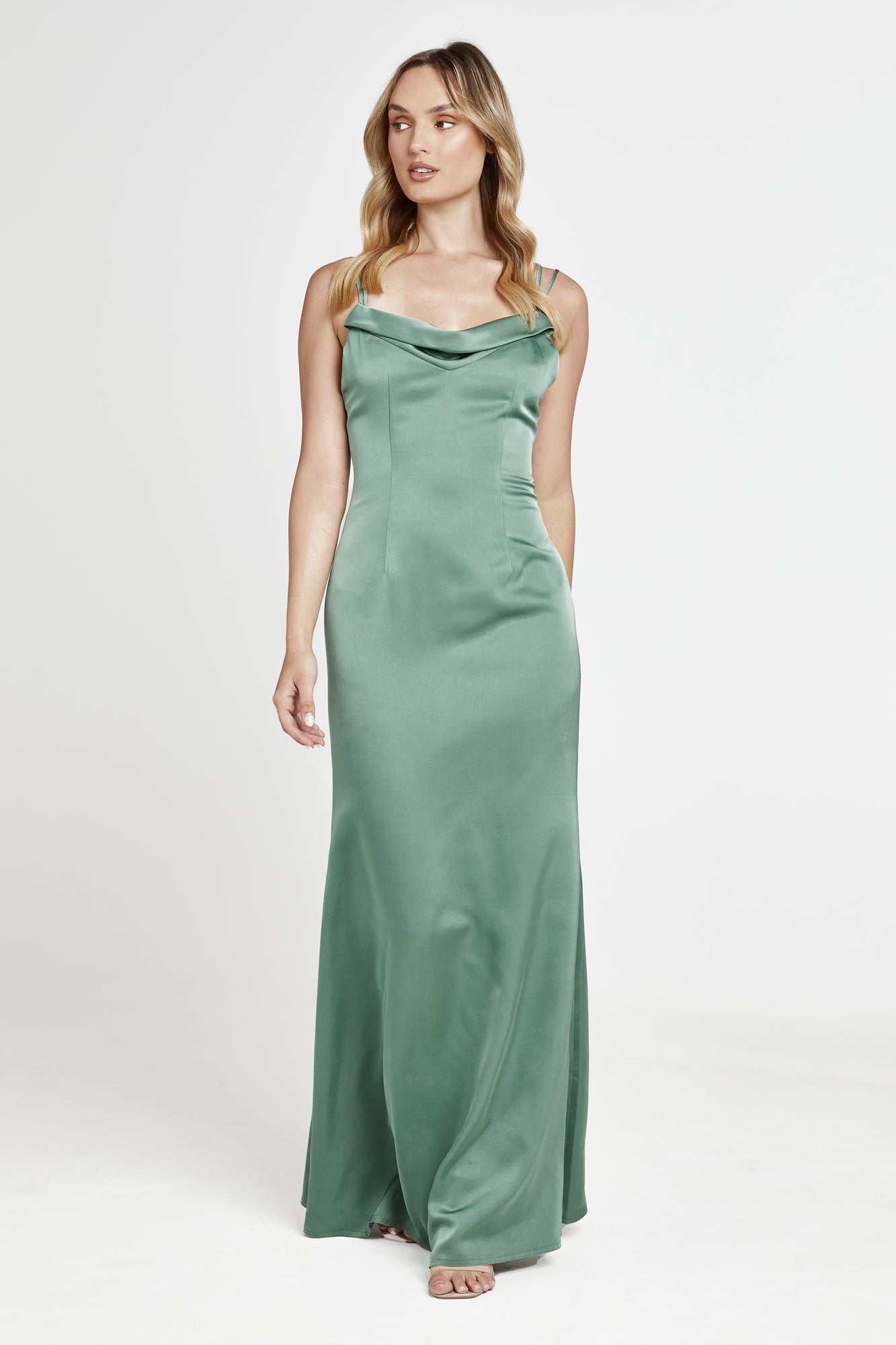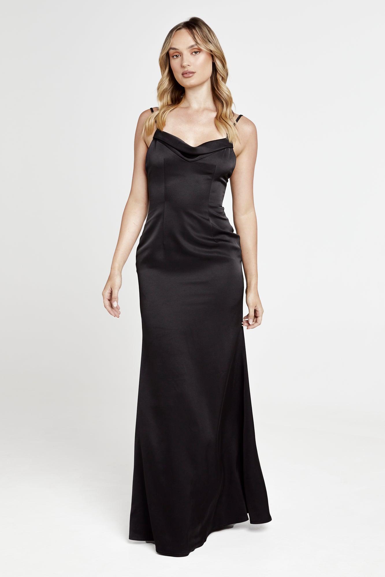 Radiate elegance in our silk satin blend gown featuring a cowl neck and double cross-strap back. Luxurious silk satin blend drapes elegantly over the décolletage, while the striking cross-strap design adds a modern twist. Perfect for any upscale event, this gown ensures you'll leave a lasting impression with every step you take.